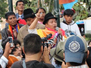 Mientras miles de delegados/as de las comunidades, pueblos y nacionalidades, movimientos sociales caminaban incansables por las calles de Ibarra y paraban frente a la Gobernación de Imbabura, edificio en la que se desarrollaba la audiencia pública. La Presidenta de la Corte interrumpía la audiencia hasta que los marchistas pasen por el lugar. Estos de forma contundente exclamaban: “Libertad Marco Guatemal”, “Viva el Movimiento Indígenas”, Viva la CONAIE”, Viva la ECUARUNARI, Viva la Chijalta FICI, “El Agua no se vende el agua se defiende”.