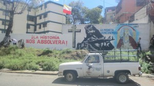 Todas estas  señales  nos confirman  una situación de alerta en la parroquia por parte de los colectivos. Escuchamos perifoneo en diferentes lugares de la zona,alguien grita  Llegamos al mural donde esta plasmada la virgen armada para entrar vía escaleras por el largo callejón que no lleva a la Piedrita donde nos recibe Adrian quien monta guardia en la reja que sirve de seguridad para acceder al  sector