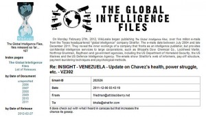 En uno de los emails, enviado en diciembre de 2011 por la Directora de Análisis de Stratfor Reva Bhalla, a George Friedman, fundador y director de la firma, se hacen revelaciones obtenidas de una fuente de la oposición venezolana, quien estaría trabajando en cooperación con el gobierno de Israel. En el mismo se hacen algunas revelaciones sobre el supuesto estado de salud del primer mandatario nacional, Hugo Chávez, quien enfrenta una batalla contra el cáncer desde mediados de 2011.