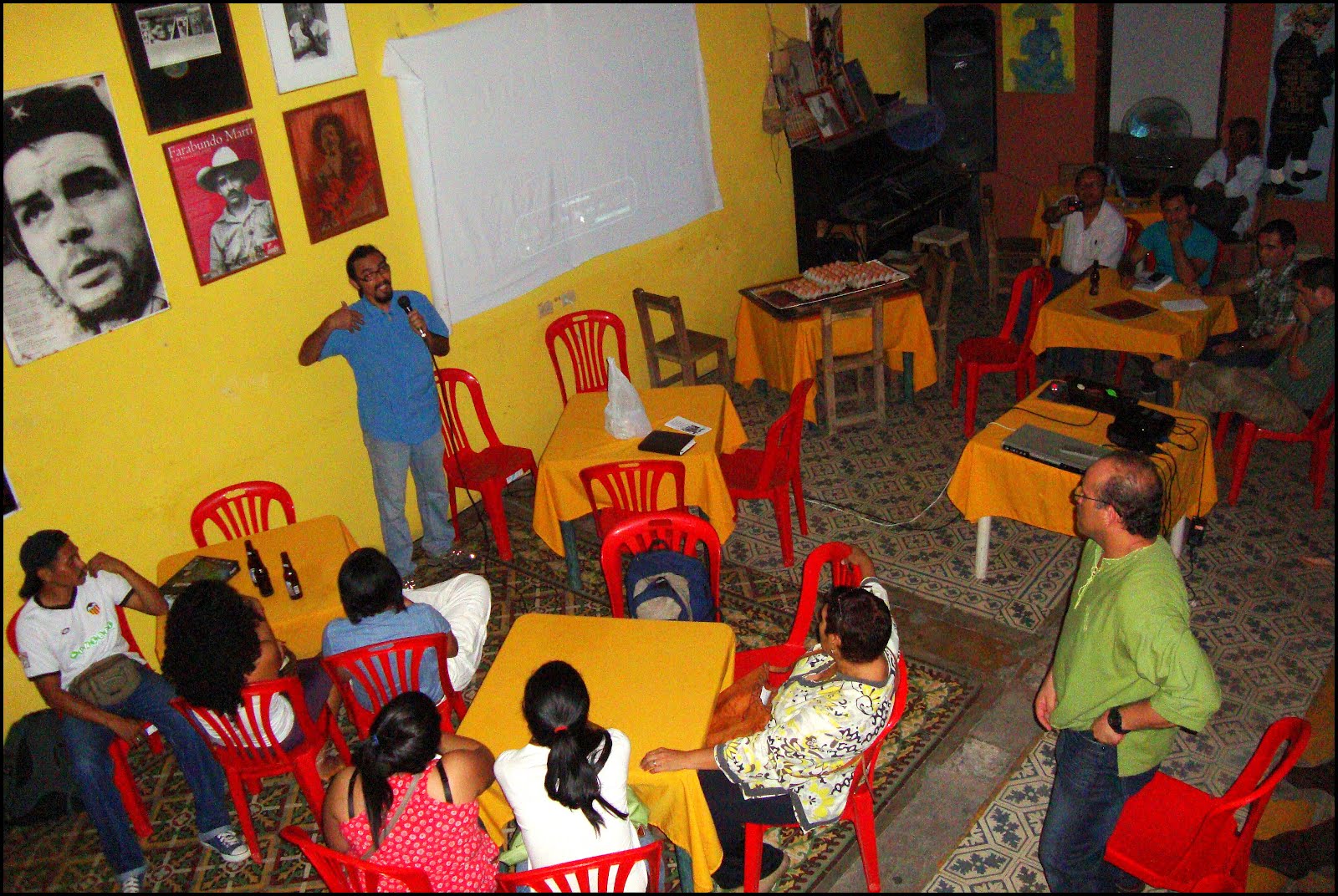Desde las 6 pm nos fuimos congregando en la sede del NUDE Capirugente, en plena calle Carabobo del casco histórico del Puerto Maracaibo. Definir logística, encuentro de amigos y de personas que por vez primera asisten a este tipo de convocatorias. Desde el río Socuy, desde Wayuumana baja la producción de gallinas ponedoras y aparecen los diseños, los colores del cosmos wayuú. La Cinema Cartonera, propuesta del PFG Gestión Ambiental de la Universidad Bolivariana de Venezuela Sede Zulia despliega sus cartones para nuevamente dar cobijo al cine militante. La humedad de mayo y de inicios de junio se hace sentir.