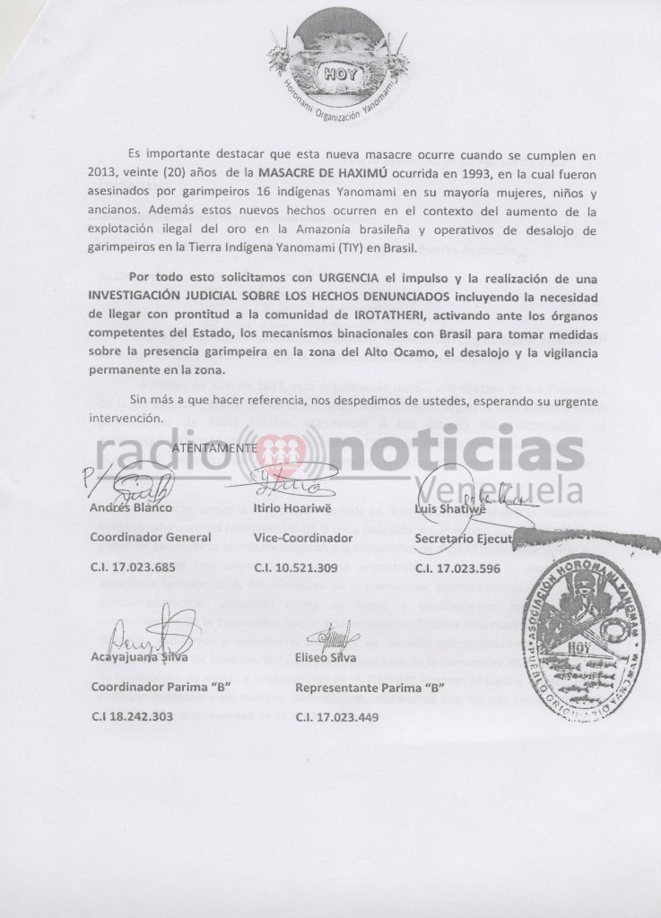 Este martes dirigentes de la etnia yanomami denunciaron la masacre de 80 personas en la comunidad Irotatheri ubicada en el municipio Alto Orinoco del estado Amazonas.