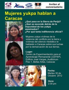 Para continuar en la lucha por romper el silencio sobre la lucha de los pueblos originarios por la tierra, el próximo martes 30 de octubre a las dos y media de la tarde en CEPAP, Universidad Simón Rodríguez estarán Zenaida Romero y Etilcia Romero compañeras yukpa heridas en los hechos ocurridos en la hacienda Medellín de la Sierra de Perijá, el pasado martes 16 de octubre.