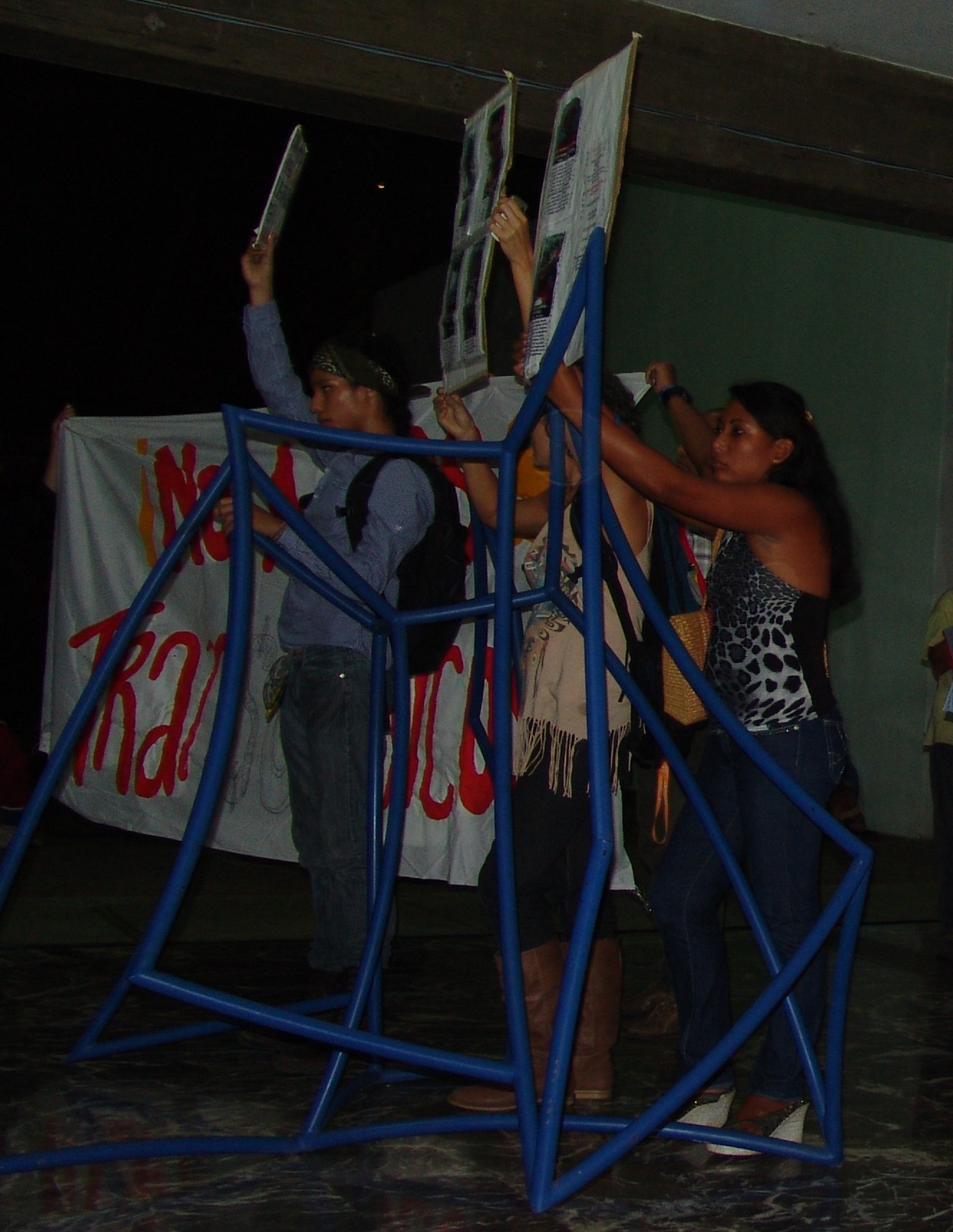 Salieron mostrando sus pancartas a toda la sala, y muchas de las personas presentes, preguntaban y pedían que les mostraran y explicarán que estaban denunciando, algunas de las compañeras explicaban mientras salían. Afuera, elevaron sus pancartas y carteles a las personas que se encontraban viendo el foro por una gran pantalla, y rindieron algunas declaraciones a medios comunitarios.