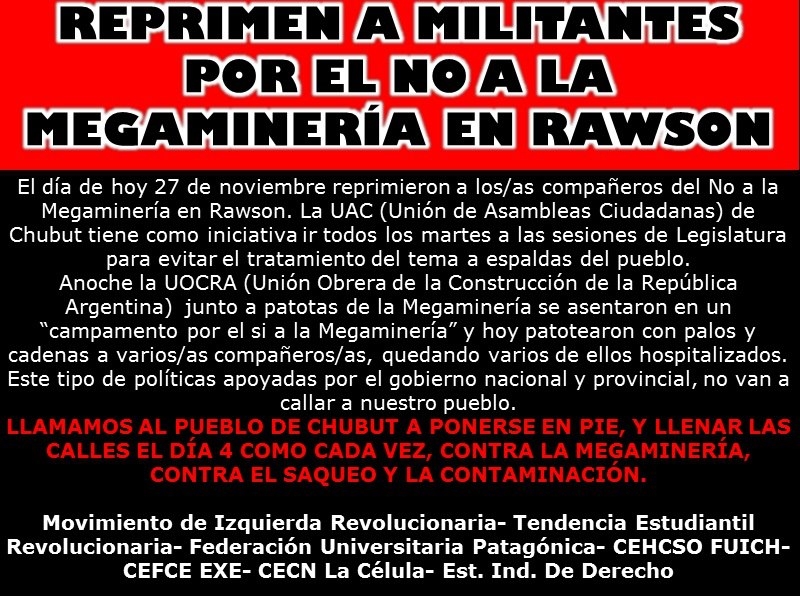 Martes 27 de Noviembre de 2012 18:18 | Este es el término que utilizaron aquellos vecinos que se encontraban presentes en los acontecimientos. Siendo las 16,30 horas de hoy martes 27/11 mientras un grupo de jóvenes, mujeres y adultos se dirigian a presenciar la sesión de los diutados fueron EMBOSCADOS por unas 300 personas con PALOS, CADENAS y PATADAS a jóvenes, mujeres y niños, encontrándose hospitalizados al menos tres de ellos. La concentración de vecinos se repite desde hace unos tres meses para impedir que se habilite la megaminería en Chubut sancionando el proyecto de ley de marco regulatorio que pretende el gobernador Martín Buzzi junto a funcionarios nacionales y en alianza con las empresas del sector. Audio de la entrevista a un vecino.