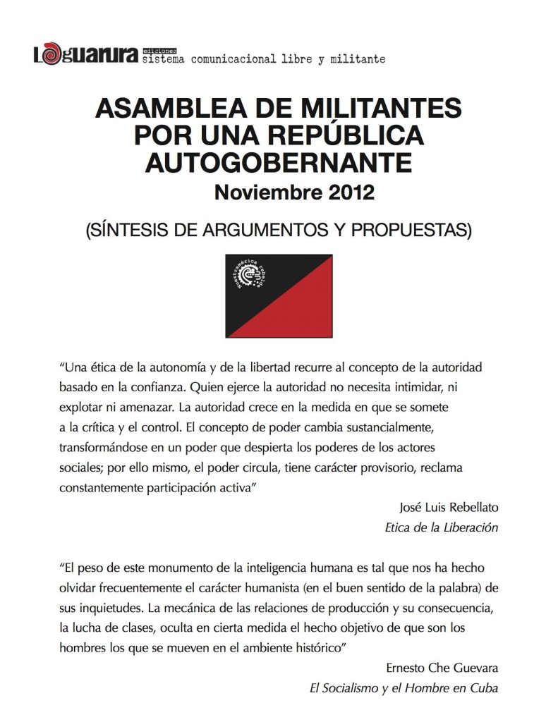 Hemos estado expresando nuestra voluntad y hasta nuestro poder si vale decirlo, que no es más que nuestro testimonio peleado y ante todo nuestra política. Intentando corregir el mal destino de otras oportunidades de encuentro orgánico, esta amplia y distinta comunidad de afectos y quehaceres liberadores demuestra que sigue totalmente viva si de corriente libertaria y de lucha se trata. Emprendemos nuevamente lo que toca hacer: llevar la lucha tan lejos como lo permitan nuestras facultades y hasta el límite de la más profunda libertad a conquistar, lo que Aquiles Nazoa ya nombró como la “Patria Buena”. Ahora toca volver al simposio del debate y el entendimiento en función de concretar una amplia causa común y organizada hecha a partir de metas acordadas y asumidas con activa responsabilidad como sitial fundamental de la unidad movimiental que ahora nos toca construir.