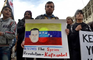 A handout image released by the Syrian opposition’s Shaam News Network on March 8, 2013, shows a demonstrator carrying a placard with the portrait of late Venezuelan President Hugo Chavez drawn over Venezuela’s national flag during a an anti-regime rally in the Syrian city of Kfar Nubul in the rebel-held northwestern province of Idlib. AFP PHOTO/HO
