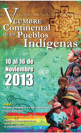 946966_417479418348666_1024168467_nPara continuar articulando nuestras demandas y propuestas y discutir las bases de un nuevo paradigma civilizatorio sustentado en el Buen Vivir, en el respeto de los derechos humanos y colectivos y en el reconocimiento de los derechos de la Madre Tierra, los pueblos indígenas y sus organizaciones convocan a la V Cumbre de Pueblos y Nacionalidades Indígenas del Abya Yala, que se realizará en el Resguardo Indígenas La María Piendamó, Colombia, del 10 al 16 de noviembre de 2013.