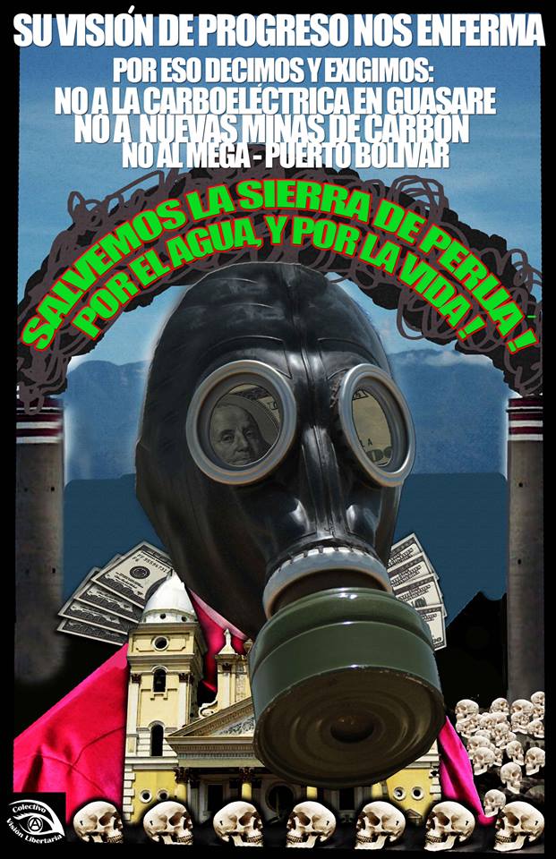 NO A LA MINERIA, A LAS REPRESAS, AL PLAN IIRSA, A LA DESTRUCCION DE LAS SELVAS Y BOSQUES. En maracaibo decimos: NO A LA CARBOELECTRICA EN GUASARE, NO AL MEGAPUERTO DE AGUAS PROFUNDAS SOBRE SAN CARLOS, SAN BERNARDO Y ZAPARA, NO A NUEVAS MINAS DE CARBON EN EL PIEDEMONTE DE LA SIERRA DE PERIJA, VIVA SABINO, VIVA LA RESISTENCIA!.