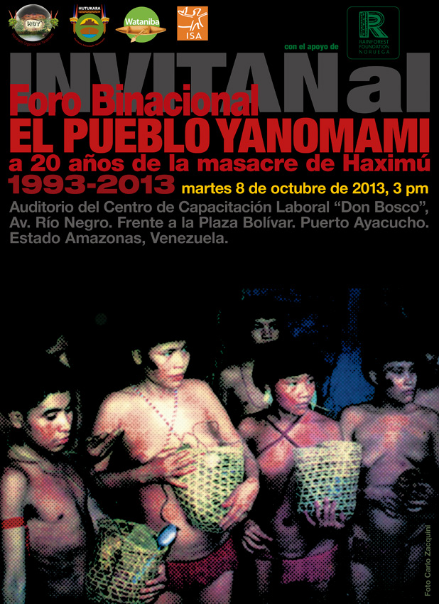 Las organizaciones Horonami y Hutukara, en representación de los Yanomami de Venezuela y Brasil, junto al Grupo de Trabajo Socioambiental de la Amazonía – Wataniba y el Instituto Socioambiental – ISA, invitan al Foro Binacional: El pueblo Yanomami a 20 años de la masacre de Haximú (1993-2013), cuando un grupo de garimpeiros (buscadores de oro brasileños) asesinaron a 16 indígenas yanomami para desplazarlos de su territorio ancestral.