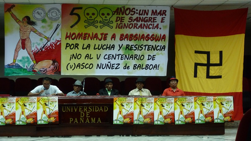 amado “descubrimiento”, la cosa va así: “Una vez más el gobierno panameño y la iglesia católica de hoy se aferran a los mismos argumentos de la invasión española y festejan con entusiasmo los 500 años del supuesto descubrimiento del Mar del Sur. Al traidor y asesino de la invasión europea a nuestras tierras, (v)Asco Núñez de Balboa, responsable del mayor genocidio de la historia, lo vuelven a celebrar por haber invadido nuestras playas y eliminado a nuestros abuelos.