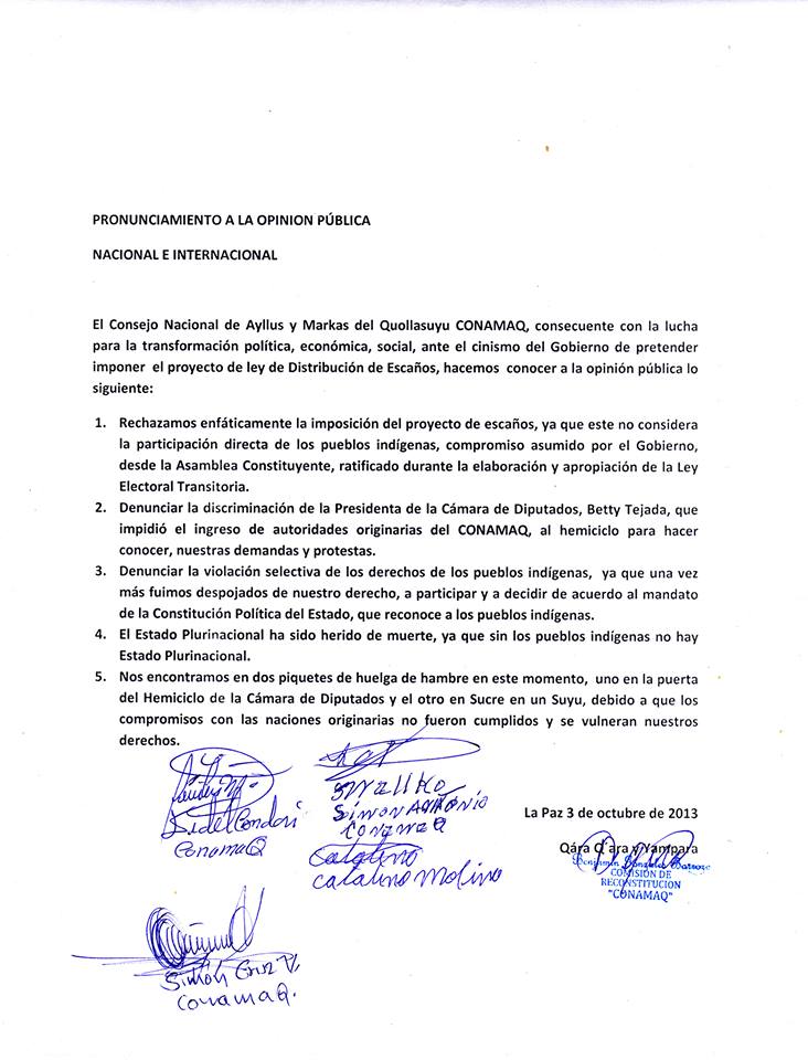 HUELGA DE HAMBRE DEL CONAMAQ: Hoy en la mañana el Mallku del Conamaq Simón Antonio Cuisa, originario del ayllu Jukumani del Norte de Postosi, Suyu Charkas Qhara Qhara, es el primer que fue dado de baja de la huelga de hambre por estado de salud muy delicada, que emprendió desde el día jueves 3 de octubre del presente año, su demanda es que se incorpore en la ley de distribución de escaños (parlamentarios) indígenas con representación directa sin intermediario de partidos políticos y aplicando la democracia comunitaria de los pueblos y naciones indígenas originarios de tierras alta de Bolivia.