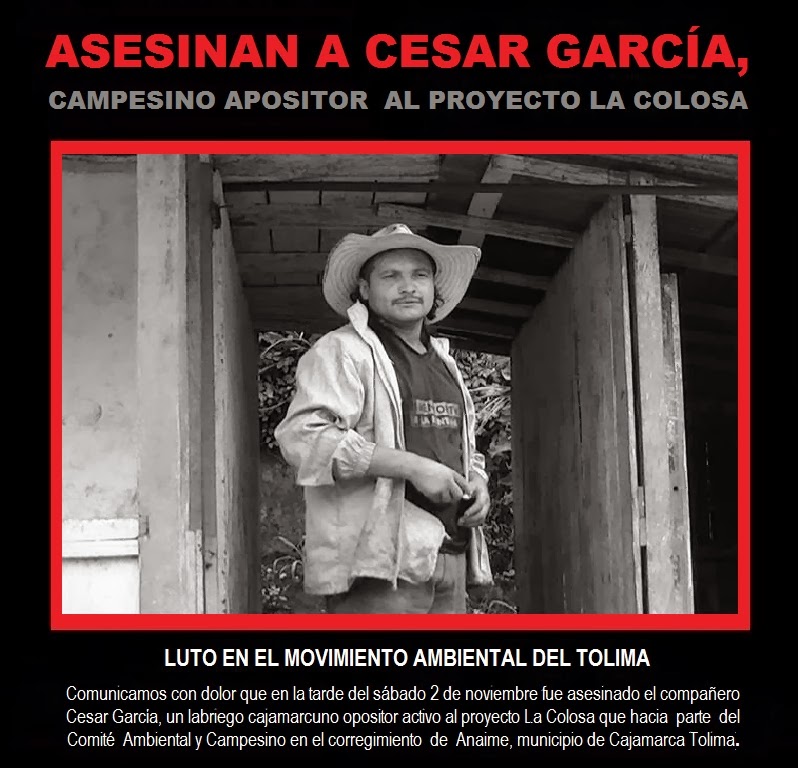 En la tarde del día 2 de Noviembre, el dirigente campesino César García, presidente de la Junta de Acción Comunal de la vereda Cajón La Leona (Cajamarca, Tolima), fue asesinado, a sangre fría, de un tiro a la cabeza mientras regresaba a su finca junto a su compañera y su hijo.