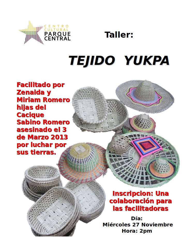 El próximo miércoles 27 de Noviembre en los espacios abiertos del Centro Cultural Parque Central, se realizara un taller de tejido yukpa: cestería y sombreros, con las hijas del cacique Sabino Romero, quienes se encuentran en Caracas vendiendo artesanía.