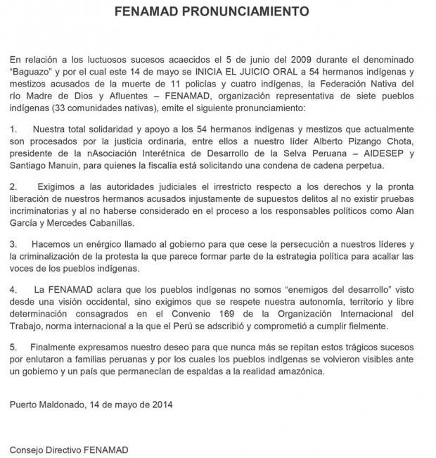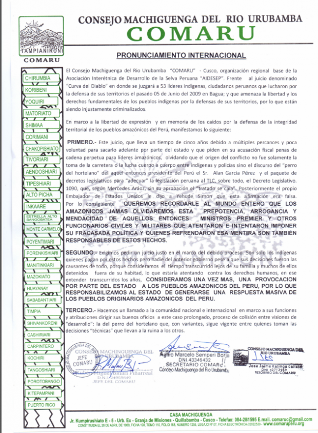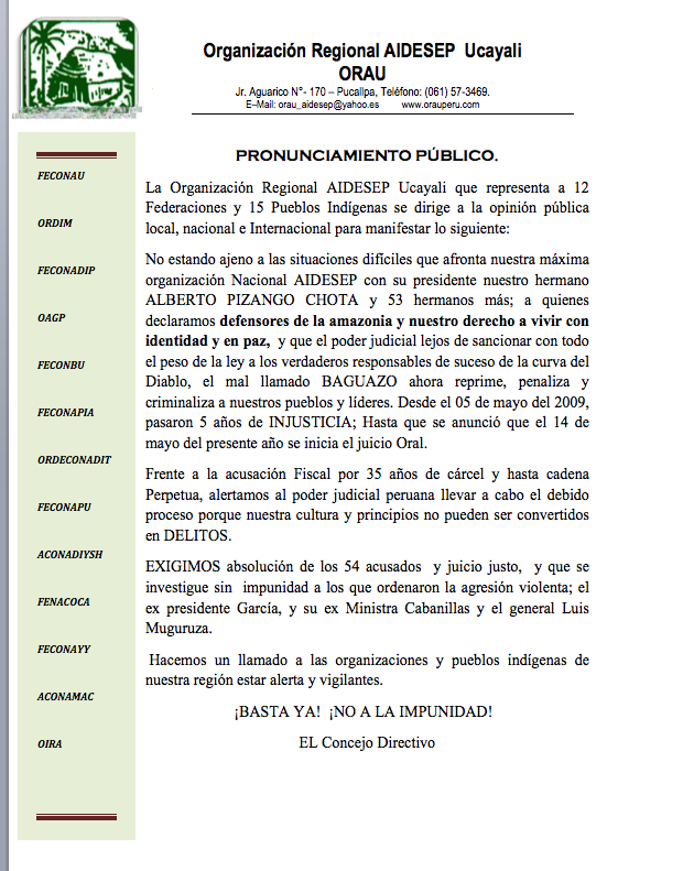 1.- Nuestra total e indeclinable solidaridad con los hermanos indígenas de la aidesep, sus organizaciones y pueblos indigenas amazonicos de base, quien han sido víctimas una vez mas de la nueva invasion y colonizacion de la cuenca amazonica en nombre del neo extractivismo, y que hoy enfrentan y defienden el honor  y el derecho de los pueblos indígenas de perú y de la cuenca amazónica a tener una vida plena en sus territorios.