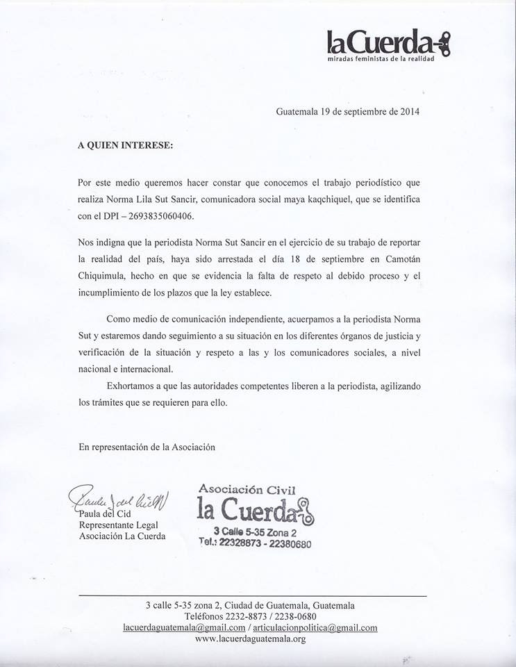 En medio de las jornadas de protesta que se organizaron en toda Guatemala los días 17 y 18 de septiembre, fue detenida la comunicadora social Norma Sut Sancir.